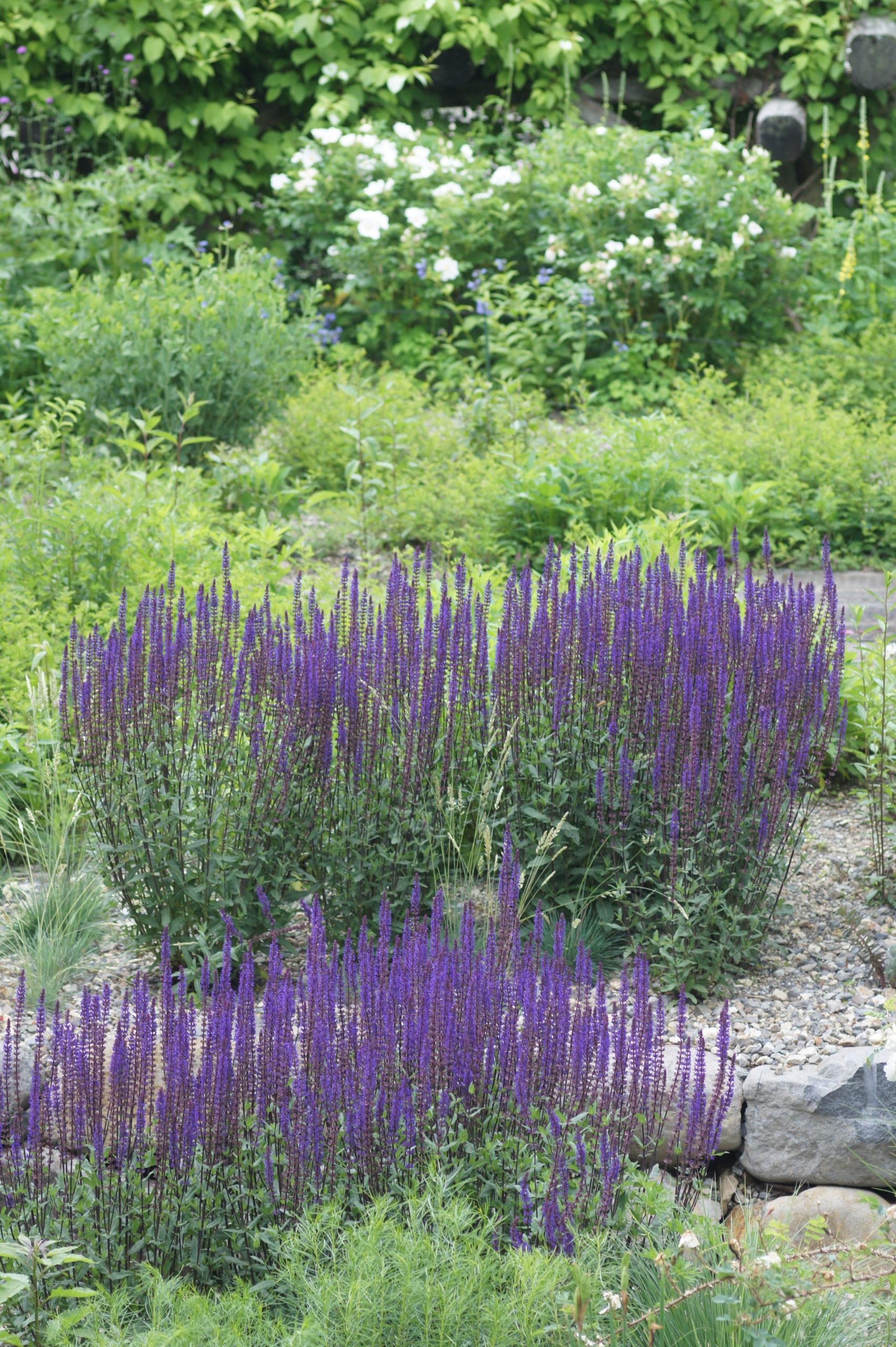 さて、低地では春の花々が咲き終わり、すっかり落ち着いてしまうけれど、標高1200mの高原では、この6月に、春のにぎわいと初夏の成熟が一気に訪れる。チョウジソウやコアヤメ、フウロソウなどの花を、今この時季でも見られるのが高原の庭の魅力。また、中旬からはさまざまな種類のバラが咲き始め、冷涼な気候ならではのバラと多年草の美しい組み合わせを見ることもできる。