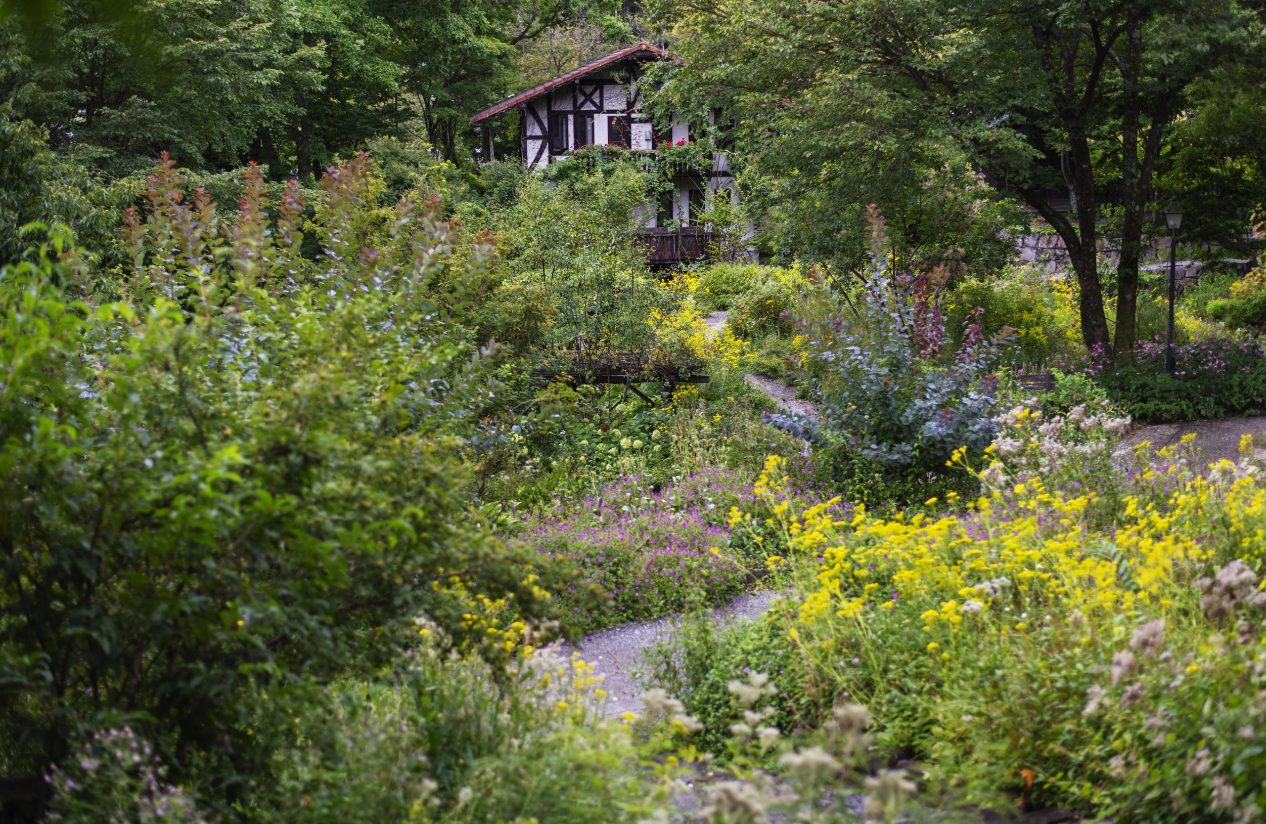 清里高原の森に隣接した高低差のある敷地には、小川が流れる「水辺のガーデン」、落葉樹に囲まれた「ウッドランドガーデン」、日当たりが良く乾燥した「グラベル&ローズガーデン」、八ヶ岳の野草が植栽された「メドウガーデン」など、さまざまな花壇がつくられています。