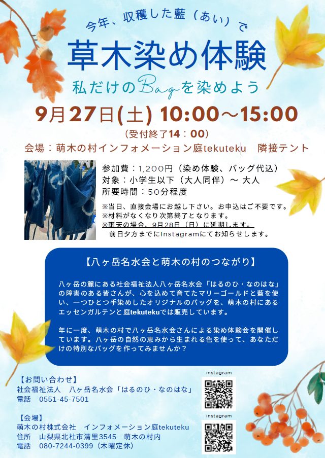 北杜市にある障がい者通所施設八ヶ岳名水会「はるのひ・なのはな」さまによる、「草木染め体験」を9月27日(土)に開催します。