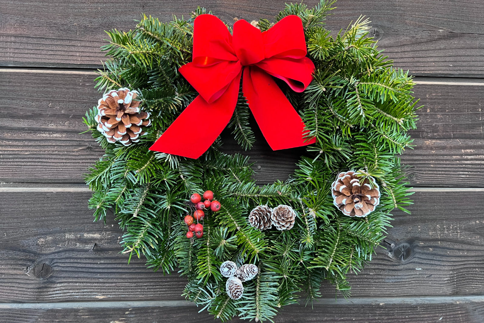真っ赤なリボンと、八ヶ岳で採れた自然の恵みを使って、森の香り豊かなリースを作りましょう。