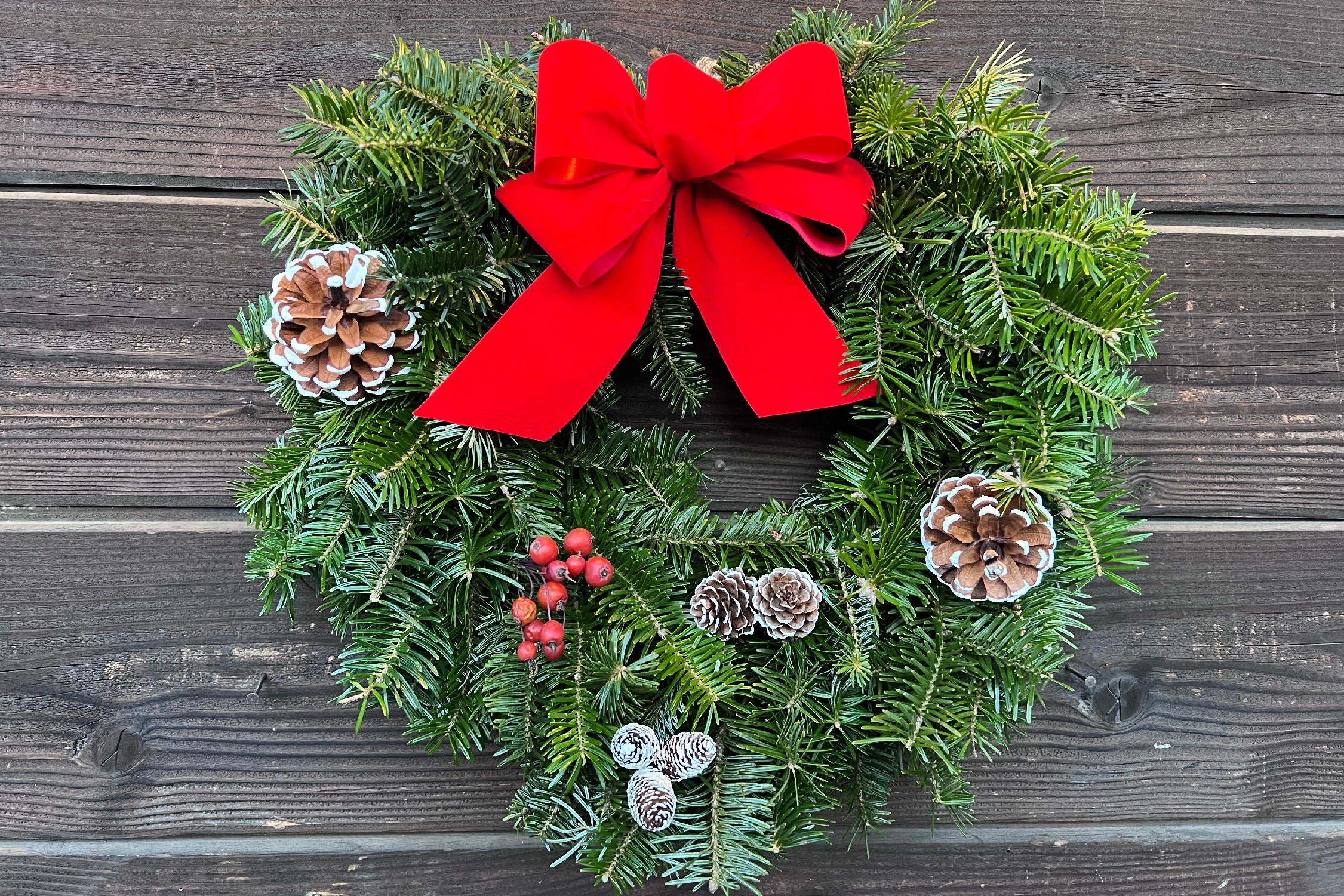 真っ赤なリボンと、八ヶ岳で採れた自然の恵みを使って、森の香り豊かなリースを作りましょう。